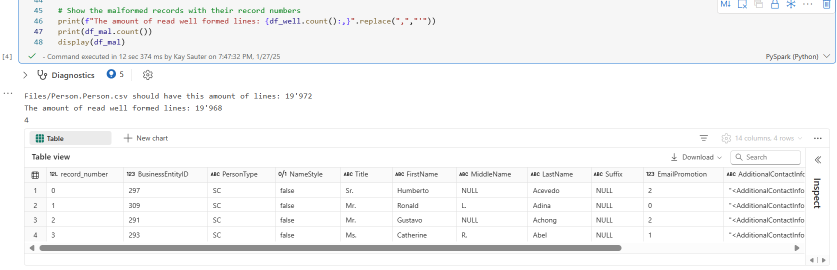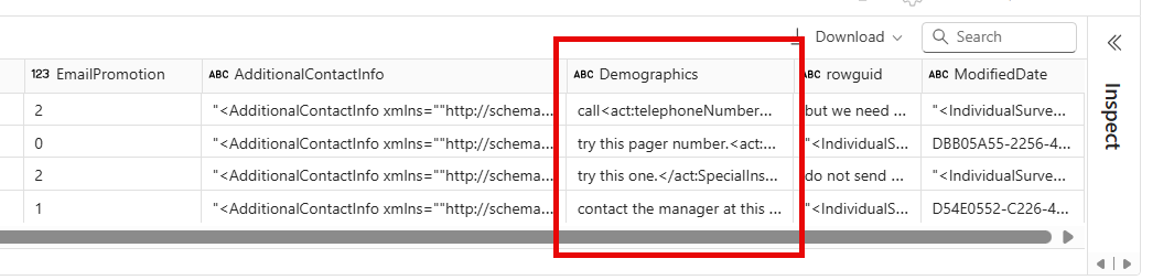 So the print output tells me that there was a load failure because of 4 lines. Those 4 lines are visible in the table. Upon investigation of this table, you can notice that something in the column “Demographics” doesn’t add up, hence the failure must have happened in the column before. Most likely, a character is responsible for this, as we see in “AdditionalContactInfo” XML data which is very prone to failures like this. So either a character needs to be taken care of or XML data in general should be attacked differently, eg. in an own table. Another possible solution is to avoid XML altogether and just scrap everything in there in a different way so that XML never gets loaded. I’m sure there could be other ideas for this, too. If you want, let me know in the comments!