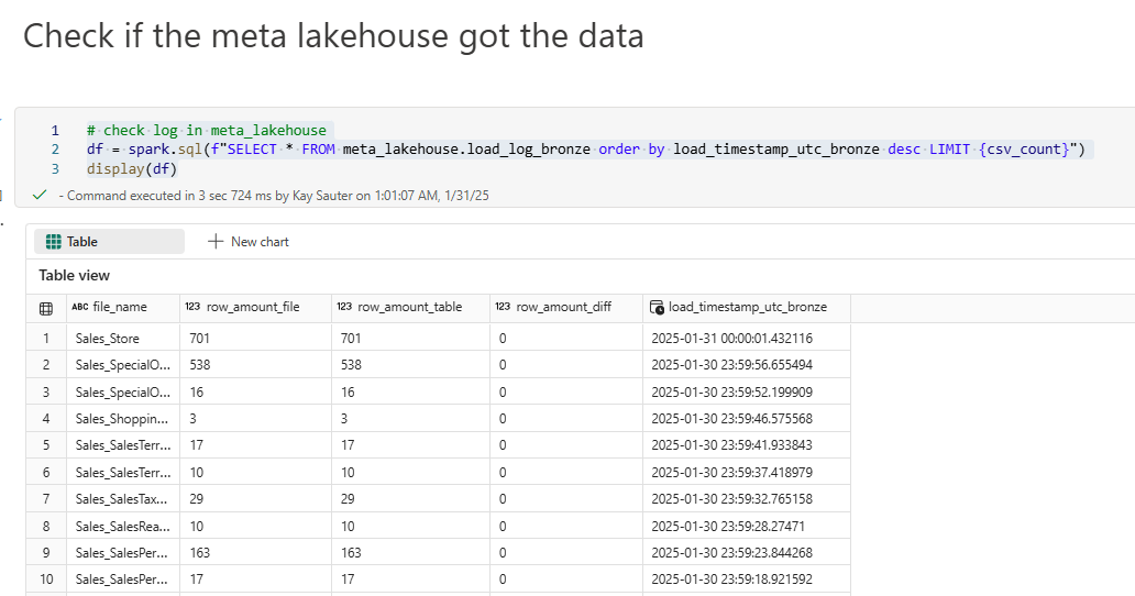 So next, in the same notebook, I’d like to see if the meta lakehouse actually received the data, too. I use the meta lakehouse for such kinds of events. This serves a lot of purposes: One being able to measure problems in the future. Do always the same files fail? Is there a pattern, maybe they only ever fail on certain dates like every leap year and nobody would know if we wouldn’t have a such log? Or every easter?