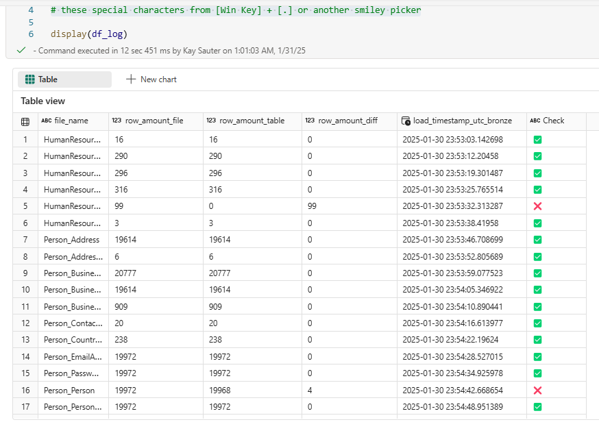 df_log = df_log.withColumn("Check", when(df_log["row_amount_diff"] == 0, "✅").otherwise("❌"))